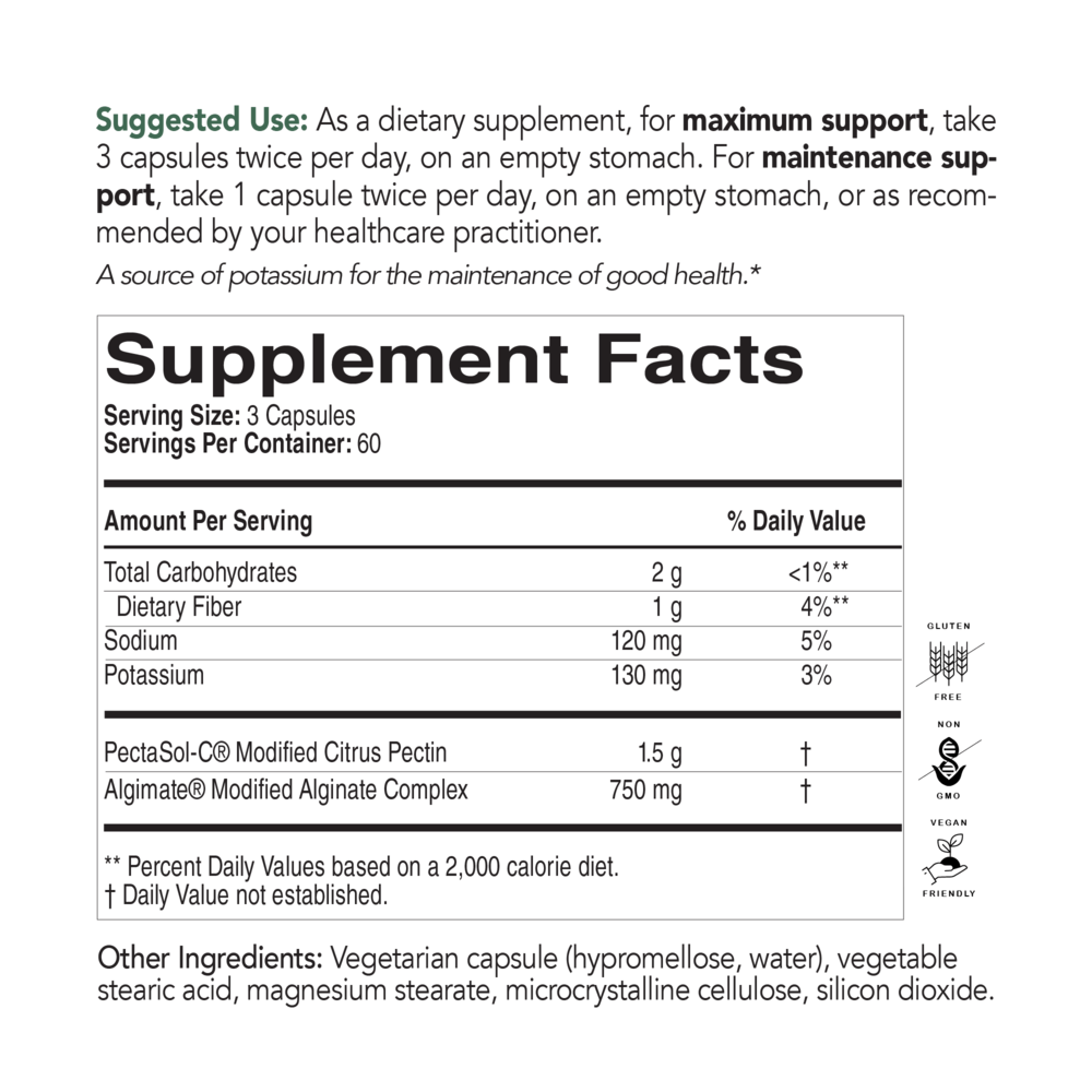 PectaClear® is a powerful blend of PectaSol-C® Modified Citrus Pectin (MCP) and modified alginates derived from seaweed. Together these ingredients work synergistically to support superior cleansing and removal of toxins and metals safely and gently.*