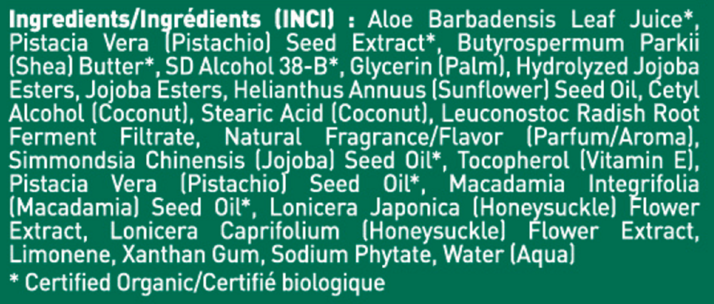 Ingredients: Aloe Barbadensis Leaf Juice*, Pistacia Vera (Pistachio) Seed Extract*, Butyrospermum Parkii (Shea) Butter*, SD Alcohol 38-B*, Glycerin (Palm), Hydrolyzed Jojoba Esters, Jojoba Esters, Helianthus Annuus (Sunflower) Seed Oil, Cetyl Alcohol (Coconut), Stearic Acid (Coconut), Leuconostoc Radish Root Ferment Filtrate, Natural Fragrance/Flavor (Parfum/Aroma), Simmondsia Chinensis (Jojoba) Seed Oil*, Tocopherol (Vitamin E), Pistacia Vera (Pistachio) Seed Oil*, Macadamia Integrifolia (Macadamia) Seed Oil*, Lonicera Japonica (Honeysuckle) Flower Extract, Lonicera Caprifolium (Honeysuckle) Flower Extract, Limonene, Xanthan Gum, Sodium Phytate, Water (Aqua) *Certified Organic