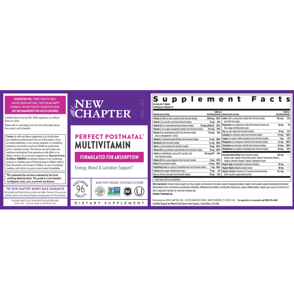 Your baby is born, and your world is changing in incredible ways. As you begin this new journey together, New Chapter will help take care of you as you care for your new baby. Our unique 3-in-1 multivitamin + multimineral + multiherbal probiotic-fermented formula is made especially to give busy moms consistent nutritional support, and includes lactation support for nursing moms.* You can rest easy knowing your postnatal vitamin is made with organic, Non-GMO ingredients. Because ingredients matter. *These statements have not been evaluated by the Food and Drug Administration. This product is not intended to diagnose, treat, cure or prevent any disease.