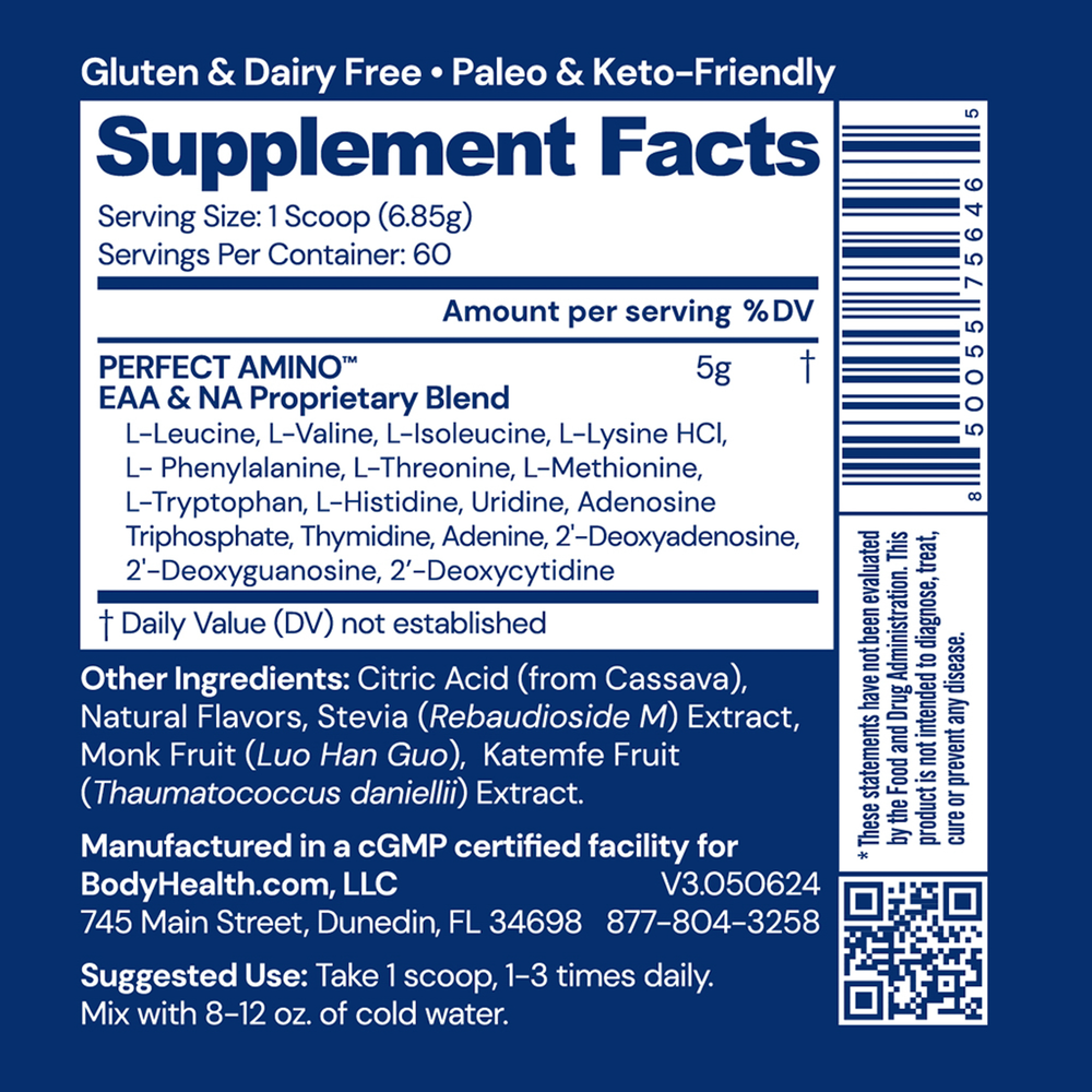 PERFECT AMINO™ is composed of pure essential amino acids, the building blocks of protein, in a form and ratio that is up to 99% utilized, but without the caloric impact and without breaking a fast. It is further enhanced with Nucleic Acid building blocks, the foundations of our DNA and RNA, helping to direct the process of protein synthesis at the genetic level and support genetic health and performance. And it’s absorbed in approximately 23 minutes.