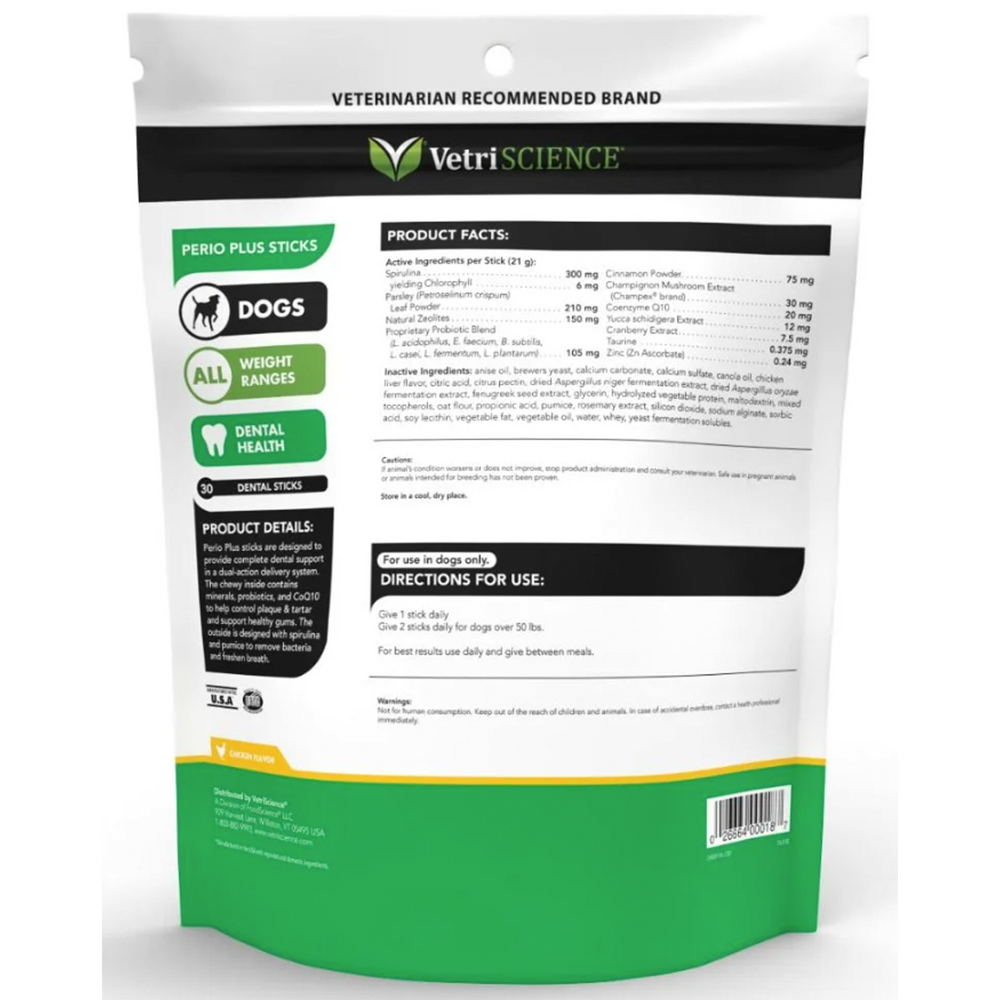 Perio Plus sticks are designed by veterinarians to provide complete dental support for dogs in a dual-action delivery system, using both physical (scraping the teeth) and enzymatic methods (disrupting plaque formation).
