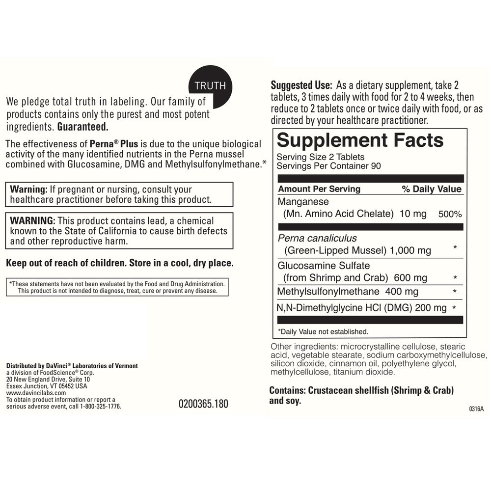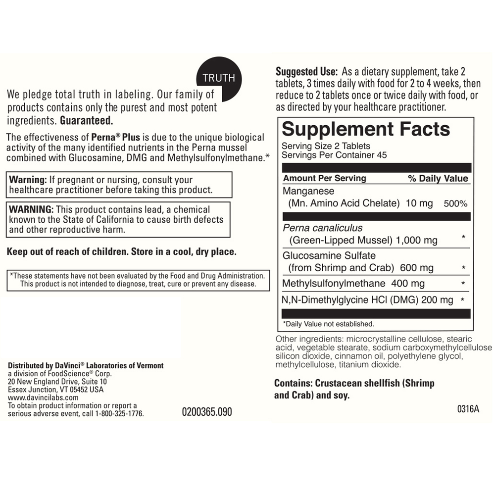 Perna® Plus is an advanced joint and connective tissue formula that can be used as an alternative or in conjunction with other joint health programs.* It combines the powerful benefits of Perna, Glucosamine, Methylsulfonylmethane (MSM), Dimethylglycine (DMG) and Manganese for a quicker response than would be seen if any nutrient was taken singularly.* Perna canaliculus is an edible species of shellfish from New Zealand. It is rich in amino acids, polypeptides, naturally chelated minerals, fatty acids, vitamins and all classes of glycosaminoglycans including chondroitin sulfates and hyaluronic acid that occur in connective tissues such as joint cartilage, tendons, ligaments and synovial fluid. The naturally-occurring components in Perna support joint lubrication and flexibility, joint comfort and range of motion.*