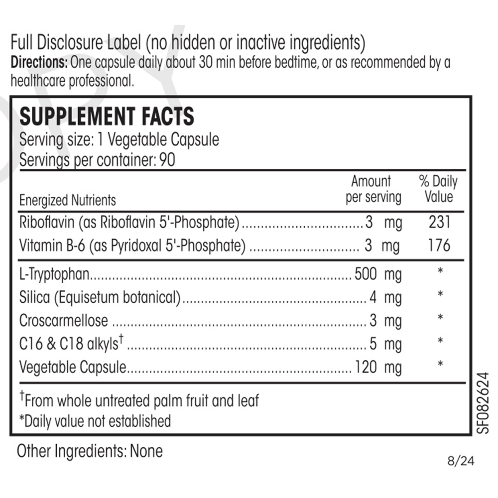 Fact: Pure L- tryptophan formulation with vitamins B2 and B6 for enhanced uptake and function.