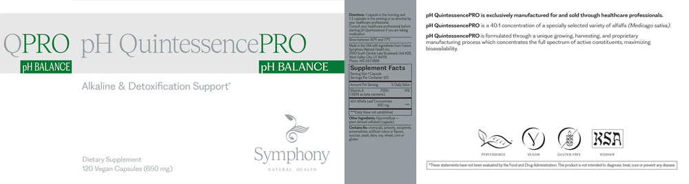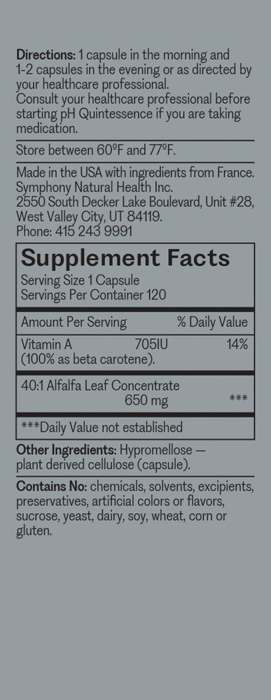 pH QuintessencePRO is a 40:1 concentrated preparation of a specially selected variety of alfalfa (Medicago sativa) from the more than 70 varieties that exist. pH QuintessencePRO is formulated through a unique growing, harvesting, and proprietary manufacturing process which concentrates the full spectrum of active constituents, maximizes bioavailability, and contains no grass allergens or phytoestrogens.