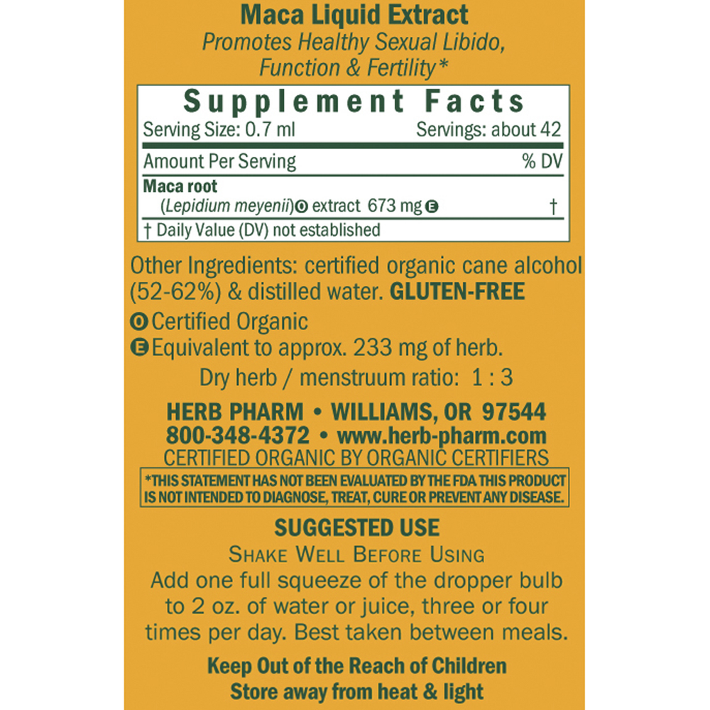 Maca extract is prepared from the dried root of Certified Organic Lepidium meyenii plants. The plants are grown for Herb Pharm at an altitude of 12,000 to 15,000 feet in the central highlands of Peru.