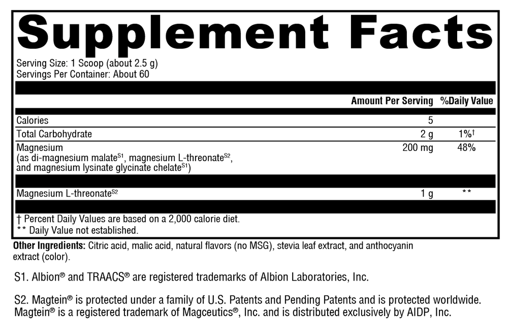 OptiMag® Neuro features magnesium L-threonate (as Magtein®), the only form of magnesium known to cross the blood-brain barrier. Complemented by highly absorbable Albion® di-magnesium malate and TRAACS® magnesium lysinate glycinate chelate, this formula is designed to boost the brain’s magnesium level. Magnesium is vital to supporting brain health and promoting healthy nervous system functions.*