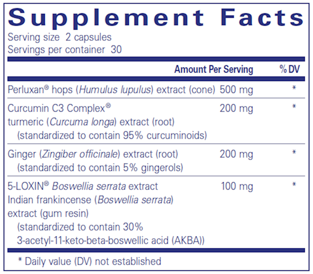 Perluxan® is a clinically studied extract of hops specifically developed to promote joint health. In a randomized, double-blind placebo-controlled trial of 36 subjects, the benefits of Perluxan® on joint comfort reached statistical significance within two hours of the first dose and were sustained over the 14-day period. Perluxan® is free of sleep-inducing and phytoestrogenic compounds typically associated with hops extracts. The alpha and iso-alpha acids in Perluxan® maintain healthy NF-kappa B-associated expression of COX-2 and cytokines such as IL-6 and TNFα in connective tissue.