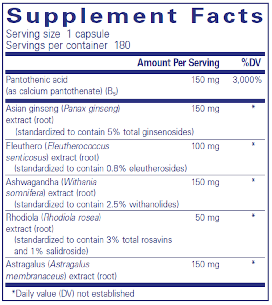 Rhodiola rosea, containing rosavins and salidrosides, also acts to balance hypothalamic-pituitary-adrenal activity. Rhodiola can have a calming effect on the central nervous system and supports healthy thyroid, thymus, and adrenal gland function. In particular, rhodiola may moderate the effects of occasional physical and emotional stress. Recently, a double-blind cross-over study suggests that rhodiola may help to moderate mild fatigue under stressful conditions. Astragalus and ashwagandha promote immune function and complement the adaptogenic activity of this formula. Calcium pantothenate, a vitamin B5 derivative, is essential for activating the adrenals. Collectively, these ingredients support the health and activity of the adrenal glands.*