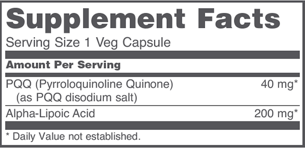 Pyrroloquinoline quinone (PQQ) is a B vitamin-like compound that not only helps to protect mitochondria from free radicals, it also promotes the production of new mitochondria within cells.* Mitochondria are the parts of the cell that produce energy. While all cells have them, the heart and brain are especially dense with mitochondria due to their high energy demands. PQQ may thus help to maintain robust cellular energy production, support heart health, and promote normal cognitive function.* Extra Strength PQQ includes alpha-lipoic acid to complement its free radical scavenging abilities.*