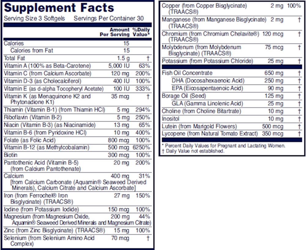 As a dietary supplement for pregnant or lactating women, take 3 softgels daily with food.