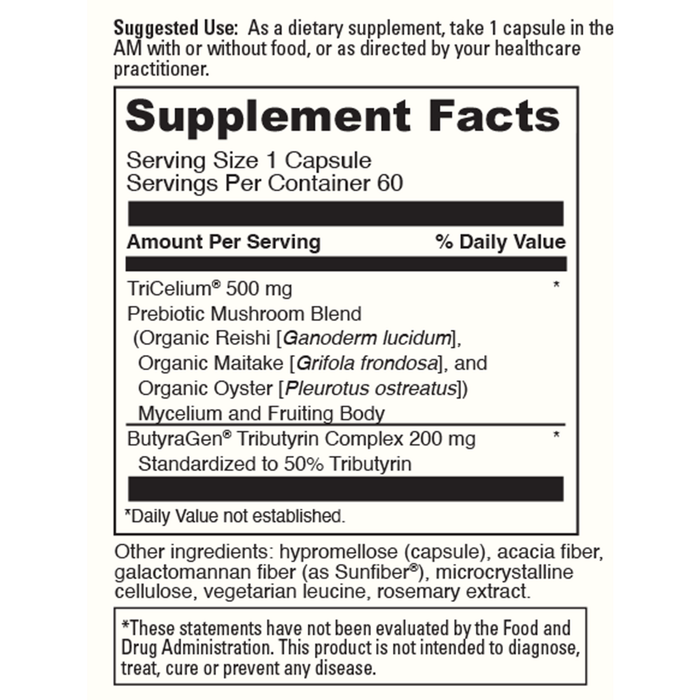 Support microbiome, gut, and immune health with a blend of studied prebiotics and three mushrooms including reishi, maitake, and oyster that help to boost levels of butyrate in the body.*