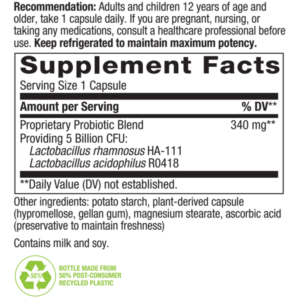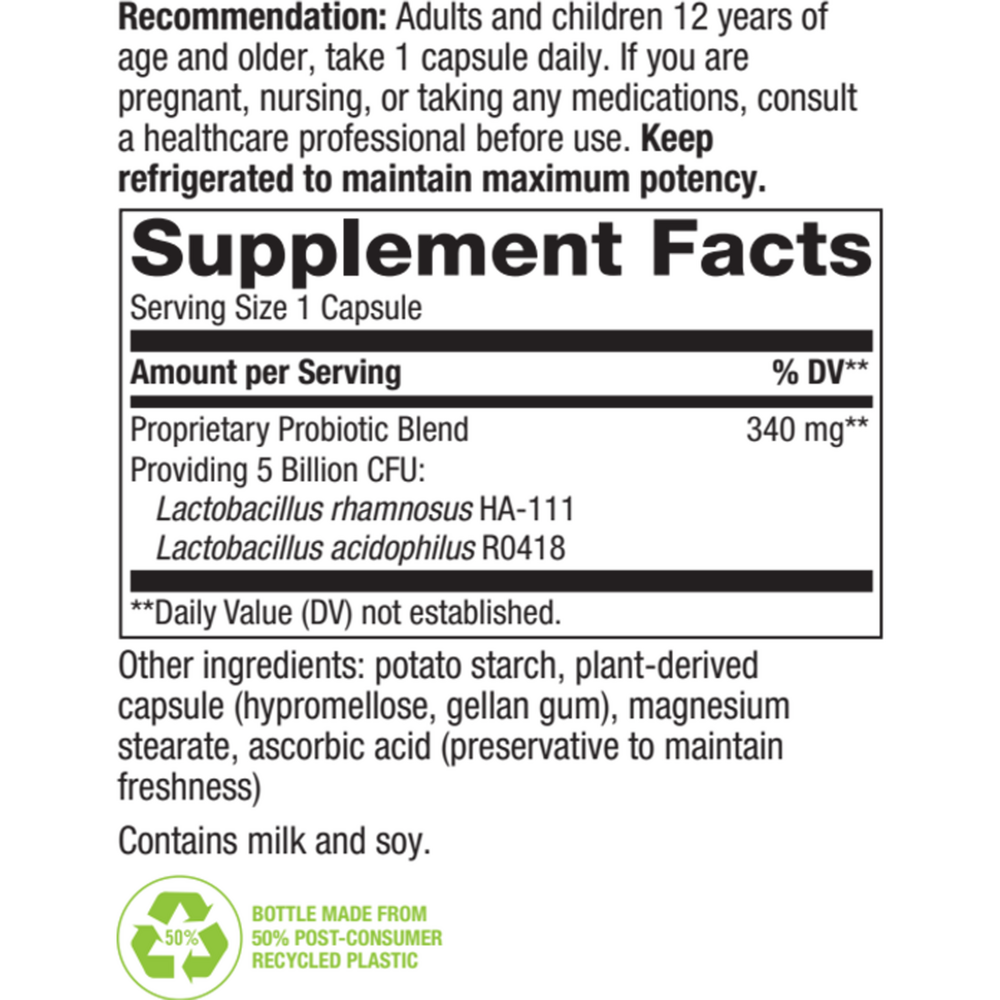 Probiotic capsules for ages 12+ with 5 billion CFUs & 2 strains of bacteria.