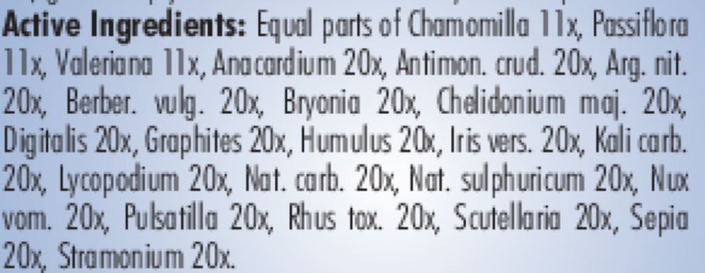 Active Ingredients: Equal parts of Chamomilla 6x, Passiflora incarnata 6x, Valeriana officinalis 6x, Anacardium orientale 15x, Antimonium crudum 15x, Argentum nitricum 15x, Berberis vulgaris 15x, Bryonia 15x, Chelidonium majus 15x, Digitalis purpurea 15x, Graphites 15x, Humulus lupulus 15x, Iris versicolor 15x, Kali carbonicum 15x, Lycopodium clavatum 15x, Natrum carbonicum 15x, Natrum sulphuricum 15x, Nux vomica 15x, Pulsatilla 15x, Rhus tox 15x, Scutellaria lateriflora 15x, Sepia 15x, Stramonium 15x.