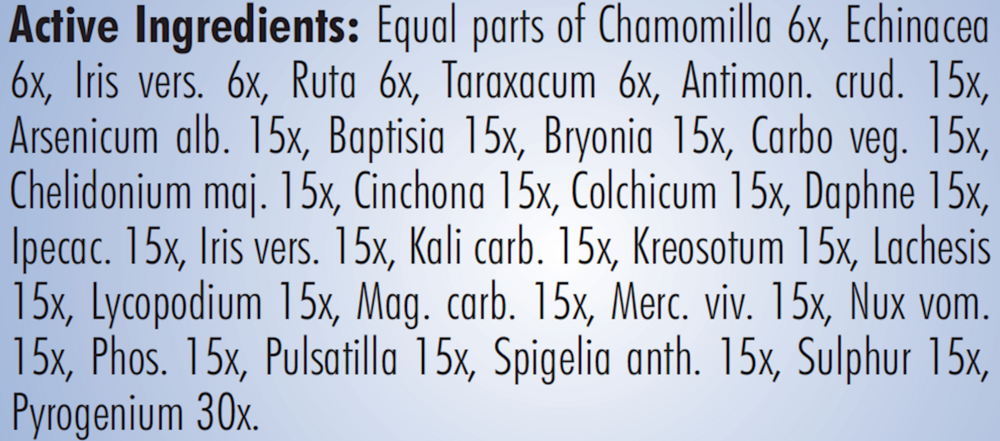 Suggested Use:Directions: ORAL USE ONLY· SHAKE WELL. Ages 12 and up, take 6 drops orally (ages 6 to 11, give 3 drops) as needed or as directed by a healthcare professional.Active Ingredients: Pyrogenium 30x, Antimon. crud. 15x, Arsenicum alb. 15x, Baptisia 15x, Bryonio 15x, Corbo veg. 15x, Chelidonium majus 15x, Cinchona 15x, Colchicum 15x, Daphne indico 15x, Ipecac. 15x, Iris versicolor 15x, Kali carb. 15x, Kreosotum 15x, lachesis 15x, lycopodium 15x, Mag. carb. 15x, Merc. viv. 15x, Nux vom. 15x, Phosphorus 15x, Pulsatilla 15x, Spigelia anth. 15x, Sulphur 15x, Chamomilla 3x, Echinacea 3x, Iris versicolor 3x, Ruta 3x, Taraxacum 3x. Inactive Ingredients: USP Purified water; USP Gluten-free, non-GMO, organic cane dispensing alcohol 20%.