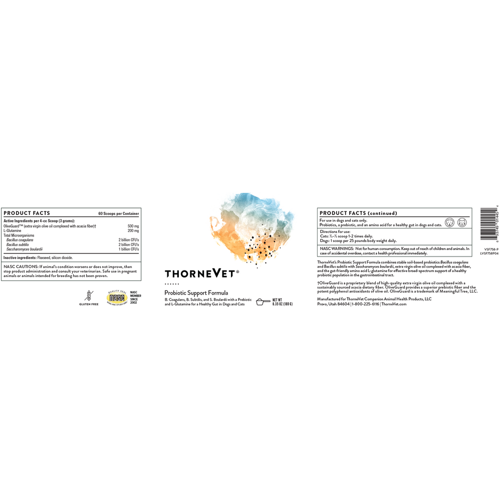 ThorneVet’s new Probiotic Support Formula combines two stable, soil-based probiotics — Bacillus coagulans and Bacillus subtilis — with Saccharomyces boulardii, the prebiotic fiber inulin, and the gut-friendly amino acid L-glutamine for effective broad-spectrum support of a healthy probiotic population in the gastrointestinal tract.