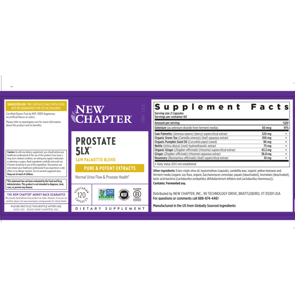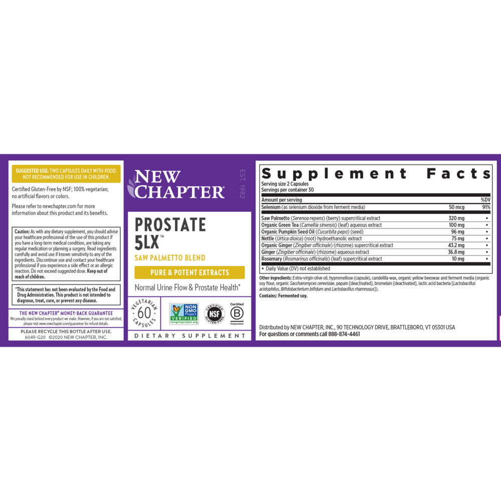 Prostate 5LX is a daily prostate supplement expertly formulated to support normal urine flow and overall prostate health.* It combines multiple prostate-supportive plant nutrients from Nettle, clinical strength Saw Palmetto, Pumpkin Seed, and other potent herbs.* New Chapter’s premier prostate supplement is also rich in fermented Selenium, a key mineral for men. The benefits of New Chapter’s Prostate 5LX add up to a comprehensive men's formula that supports your quality of life—day and night.* *These statements have not been evaluated by the Food and Drug Administration. This product is not intended to diagnose, treat, cure, or prevent any disease.