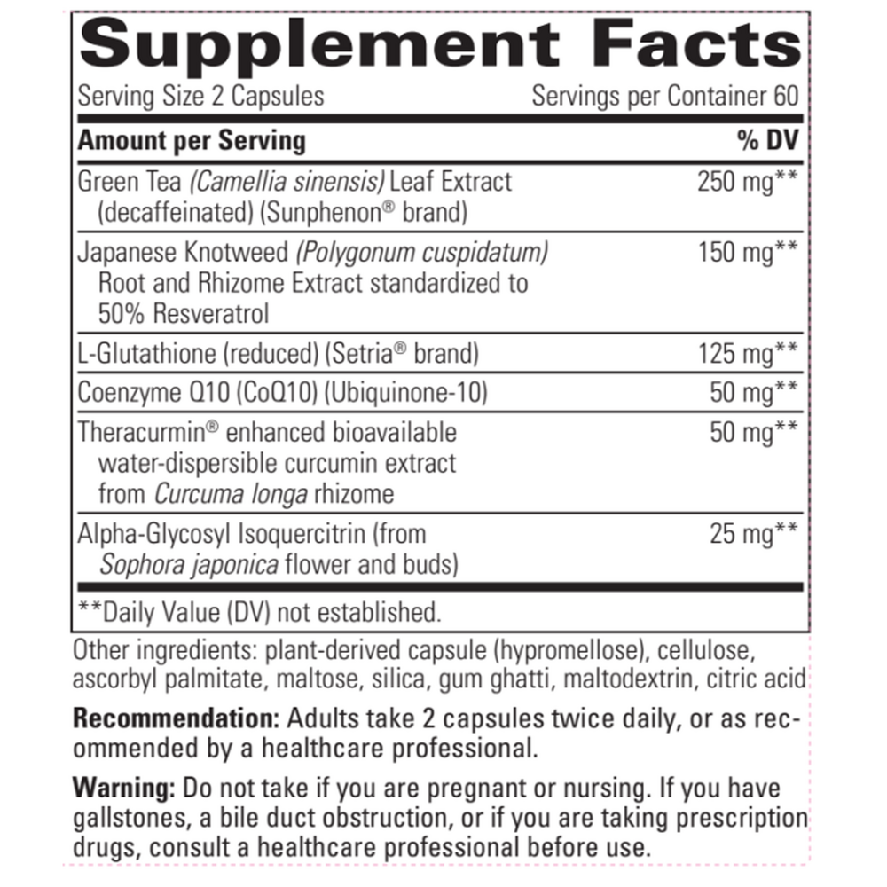 • ProThrivers Wellness Flavonoid Complex features Theracurmin®, a unique , highly bioavailable formulation of turmeric. Theracurmin is water-dispersible and the subject of ongoing research. Curcurmin, the primary active constituent of turmeric, is a bioactive polyphenolic compound.• Green tea extract: Sunphenon® brand green tea extract, which has been the subject of studies of interest to thrivers.• Resveratrol: Cell culture and experimental animal studies have found that resveratrol can quench reactive oxygen species and induce the expression of glutathione peroxidase, SOD dismutase and catalase.• Alpha-Glycosyl Isoquercitrin: Quercetin is a flavonoid ubiquitous in plants. Quercetin has various mechanisms of action shown in preclinical studies that underlie its potential health-supporting effects. However, quercetin is poorly absorbed. This formula utilizes alpha-glycosyl isoquercitrin, which has nearly 18 times the absorption of quercetin aglycone.*• Reduced L-Glutathione: Setria® brand glutathione.• Coenzyme Q10: Ubiquinone (CoQ10) is an essential co-factor in oxidative phosphorylation, the final step of mitochondrial energy production. Mitochondrial energy metabolism and antioxidation balance are two mechanisms for which CoQ10 acts.*About ProThrivers Wellness