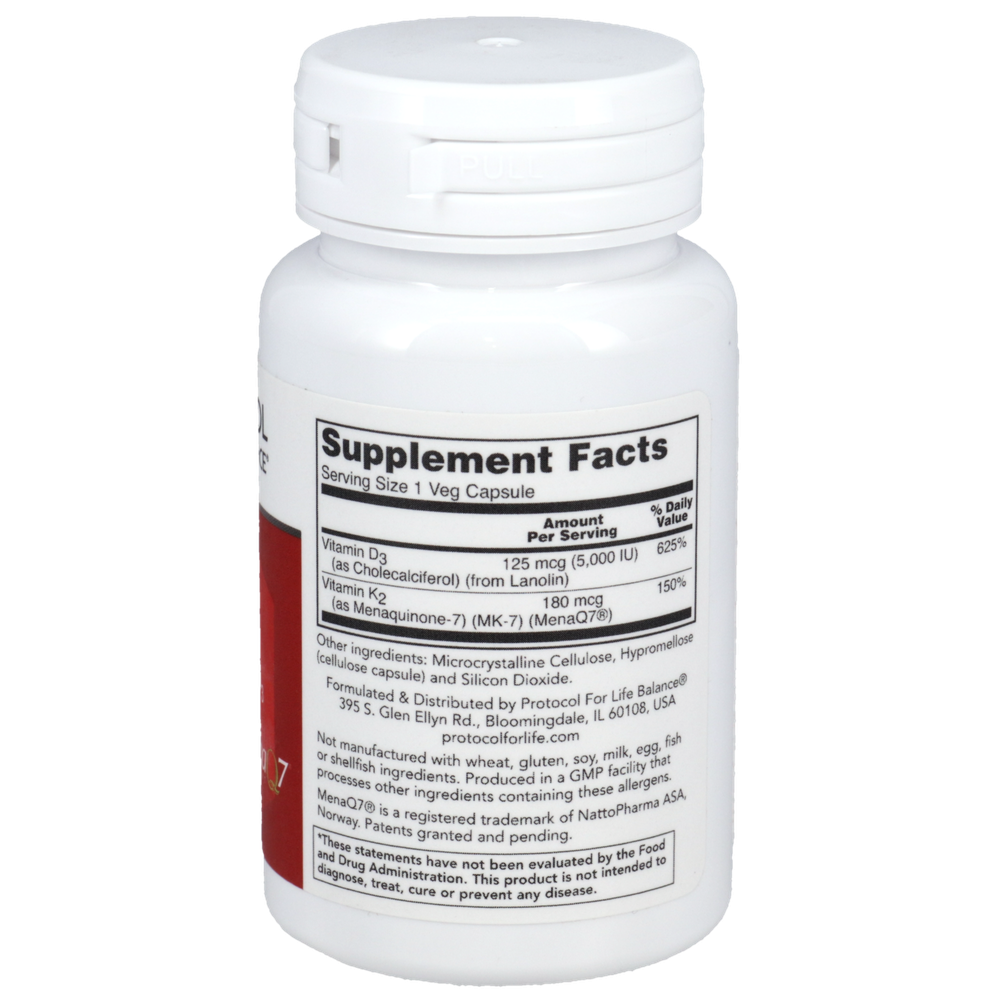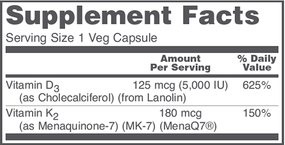 Vitamins D3 and K2 have been extensively studied regarding their roles in calcium metabolism.* Research indicates that a synergistic relationship exists between vitamin K2 and vitamin D3, especially in terms of bone strength and cardiovascular health.* While vitamin D3 is recognized for its role in calcium absorption and metabolism, it is vitamin K2 that directs calcium to bones rather than joint spaces and arteries.* This product is formulated with a clinically relevant dose of MK-7, a unique, soy-free form of vitamin K2 that has been shown to promote healthy vascular structures.*
