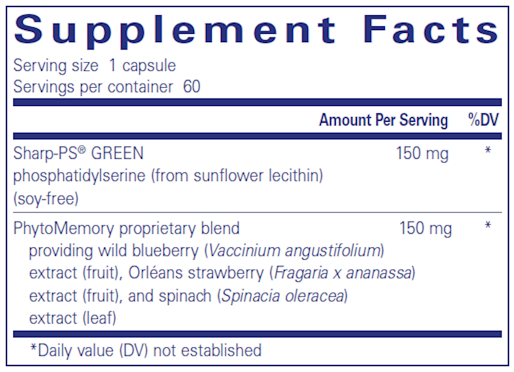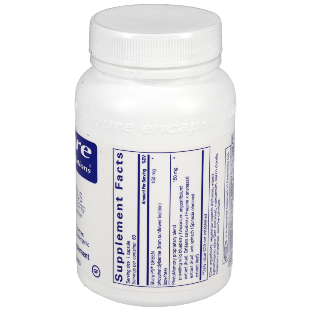 PS Plus provides Sharp-PS® GREEN, a soy-free, sunflower lecithin-derived phosphatidylserine. Phosphatidylserine (PS) is the most abundant phospholipid in the brain, where it supports neuron membrane fluidity, signal transduction and cell-to-cell communication for healthy neurocognitive function. PS provides support for normal age-associated memory decline in the elderly as well as support for overall learning, recall and processing capacity. These effects on cognitive performance were also observed in a study of young adults.
