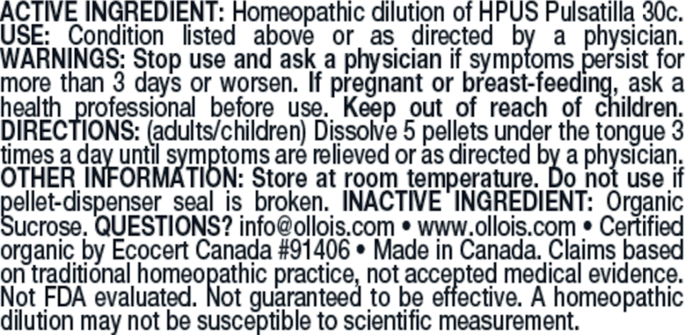 Homeopathic. Ollois organic certified and lactose free Pulsatilla 30C is traditionally used for: ocular or nasal yellow discharge with a cold or pink eye and styes.†