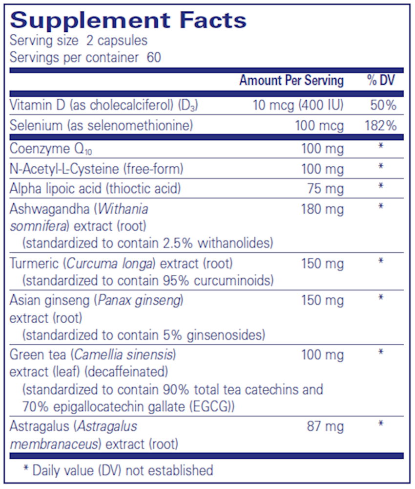 This formula offers advanced antioxidant and adaptogen support for maintaining cell health and protecting healthy tissue. Antioxidant vitamins and minerals promote healthy cell function and cell longevity, as indicated in numerous trials involving over 8,500 individuals. Adaptogens are important for physiological and cellular homeostasis and have positive effects on immune function and oxidative stress. This product was designed to: