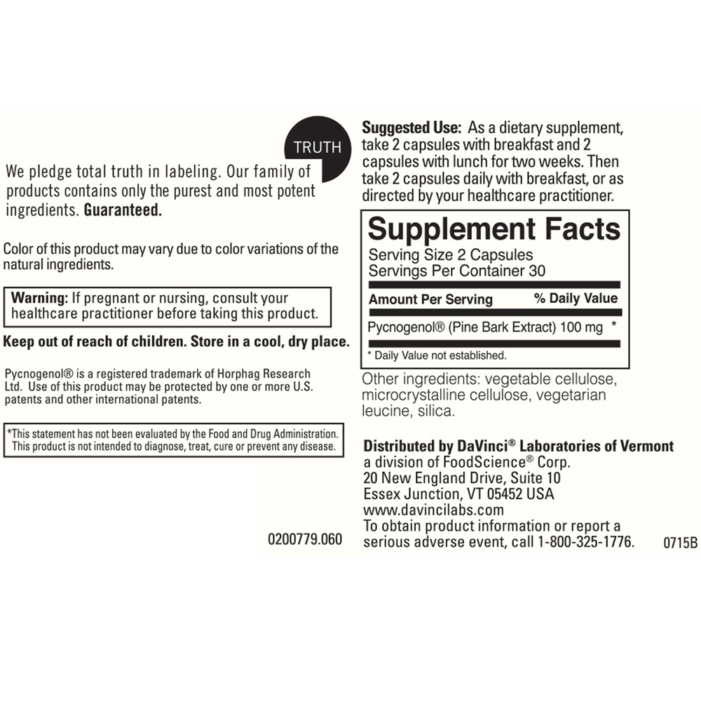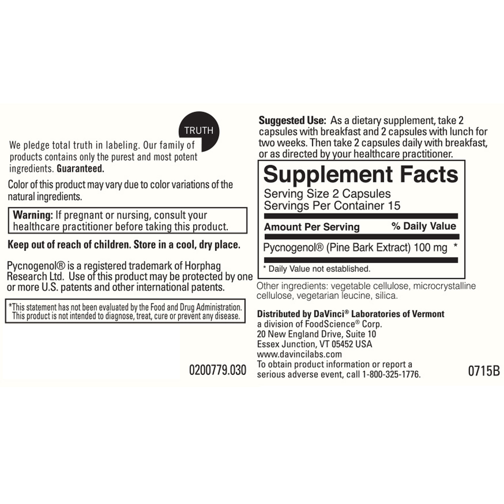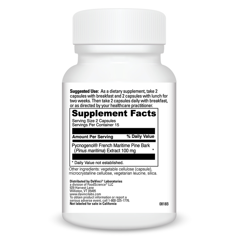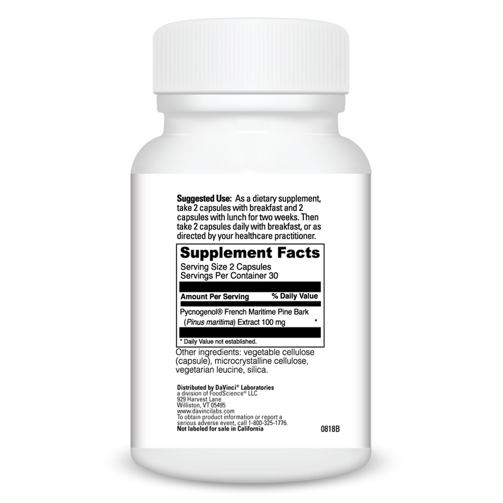 A dietary supplement to support vascular function and skin health.* A natural plant product made from the bark of th European coastal pine (Pinus maritima). Pycnogenol® pine bark extract is a concentrate of a special class of bioflavonoids called proanthocyanidins. Pycnogenol® is standardized to yield 85 mg (85%) proanthocyanidins per two capsules.