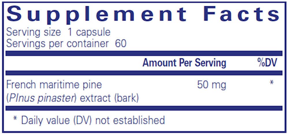 “Pycnogenol” originally denoted all proanthocyanidin extracts, regardless of source. However, it now refers specifically to maritime pine bark. The mixture of proanthocyanidins in pine bark supports vascular endothelial integrity by stabilizing collagenous membranes. It also promotes vascular function by modulating nitric oxide levels. In addition to facilitating vitamin C regeneration and preserving vitamin E, Pycnogenol® is a hydroxyl and superoxide radical scavenger. Collectively, these actions promote the health of blood vessels.*