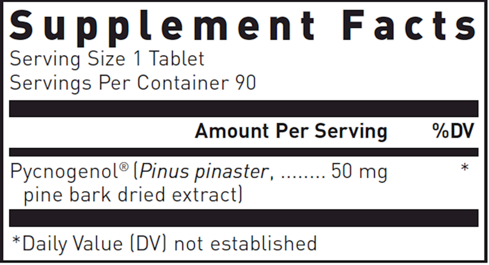 Pycnogenol® tablets contain pure, patented pine bark extract in 50 mg scored tablets. Pine bark extract is a bioflavonoid that supports blood vessel, tissue and arterial health.*
