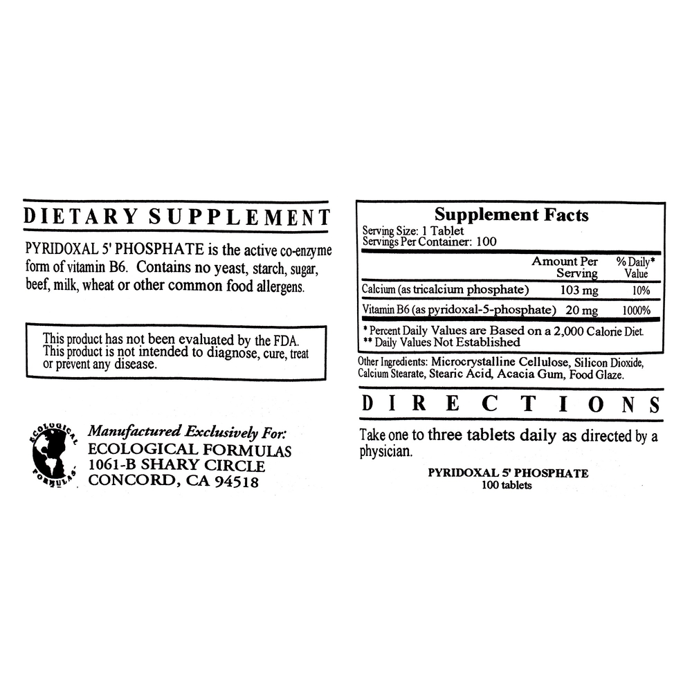 Pyridoxal 5-Phosphate 20 mg by Ecological Formulas is a dietary supplement designed to support healthy brain and nerve function in addition to facilitating the process of transforming amino acids into energy.* Pyridoxal 5-Phosphate 20 mg by Ecological Formulas provides the body with the active co-enzyme form of vitamin B6, vital for assisting with a variety of metabolic processes in the body, including cell production, tissue repair and immune system response.*