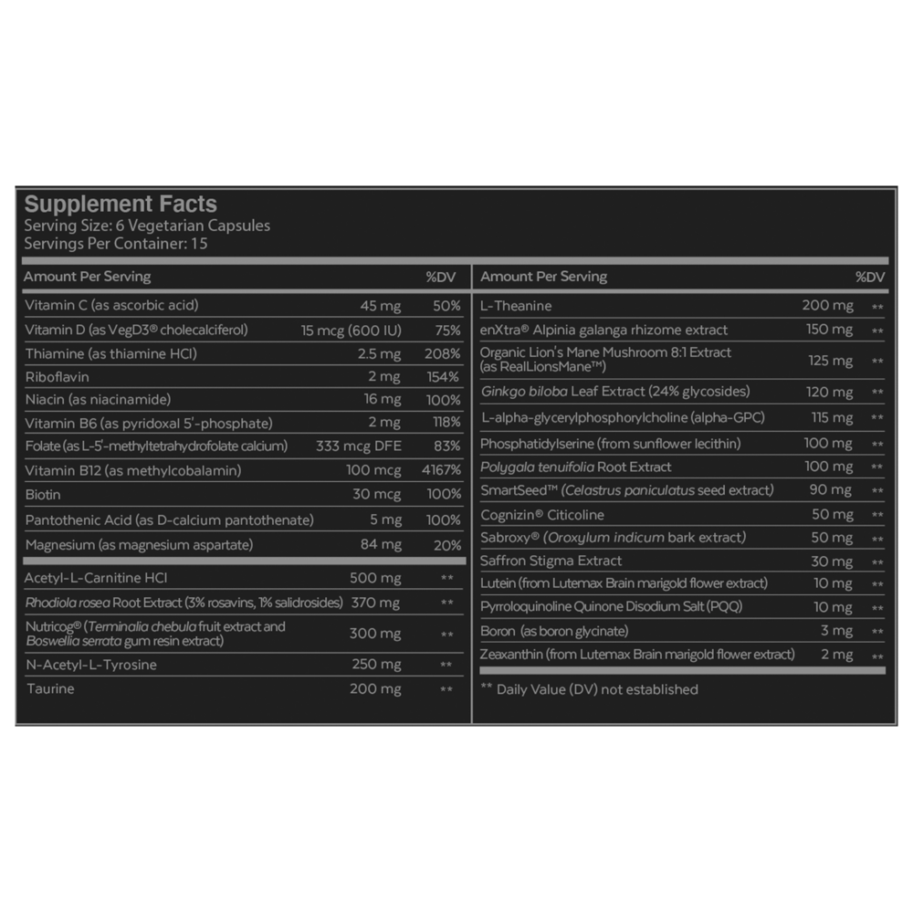 VegD3® is a trademark of Avlaan, Inc. VegD3® is a plant based, vegan vitamin D3 exclusively distributed by AIDP, Inc. Cognizin® is a registered trademark of Kyowa Hakko Bio Co., Ltd. Nutricog® is a registered trademark of PLT Health Solutions - Laila Nutraceuticals, LLC. RealLionsManeTM is a trademark of North American Reishi. SmartSeedTM is a trademark of Neurohacker Collective, LLC. Sabroxy® is a registered trademark of Sabinsa Corporation. enXtra® is a licensed trademark and Lutemax is a trademark of OmniActive Health Technologies Ltd.
