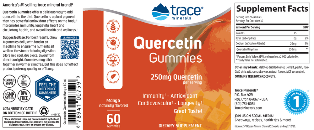 Quercetin Gummies offer a delicious way to add quercetin to the diet. Quercetin is a plant pigment that has powerful antioxidant effects on the body.* It promotes immunity, longevity, heart and circulatory health, and overall health and wellness.*