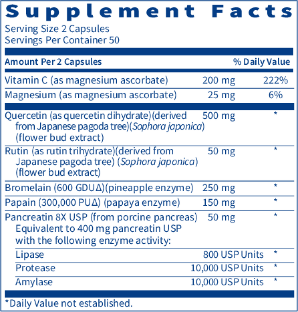Quercetin-Bromelain Forté™ provides a mixture of proteolytic enzymes and bioflavonoids that help regulate the immune cytokine response.* Quercetin is a powerful bioflavonoid that protects cells and tissues against free radicals.* Bromelain, papain, and pancreatin provide a mixture of protein-specific and other enzymes that help ensure proper breakdown of protein molecules that may otherwise cause irritation.* Vitamin C, buffered with magnesium to eliminate acidity, supports histamine metabolism, detoxification processes, and collagen synthesis.*