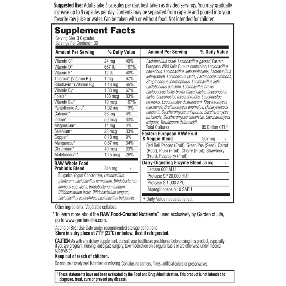RAW Probiotics is a unique line of high-potency, RAW, whole food probiotics that are age- and gender-specific. Unlike isolated strains of probiotics, RAW Probiotics offers all the benefits of a true “food” probiotic with a record-setting 30+ probiotic strains. So, it’s not just isolated bacteria in a pill; RAW Probiotics is a whole-food probiotic that emulates eating fermented food. Made with mainly Bulgarian yogurt concentrate, Wild European kefir grains and scobies, and concentrated clinically studied probiotics strains, RAW Probiotics is created below 40º F and 30% humidity so that what you see on the label is what you get in the bottle.
