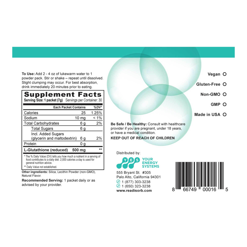 Introducing ReadiSorb GO, the powerful antioxidant Liposomal Glutathione in powder form. Thirty (30) packets per box, each packet contains 500mg of glutathione. This product tastes great, using non-allergenic botanical flavoring. Just mix with water and enjoy; no refrigeration is necessary. And it is perfect for travel.