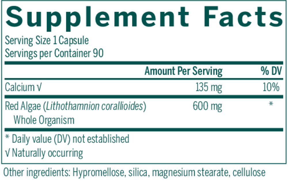 • Red algae extract comprised of minerals which most closely mirror the naturally-occuring mineral matrix found within the human body