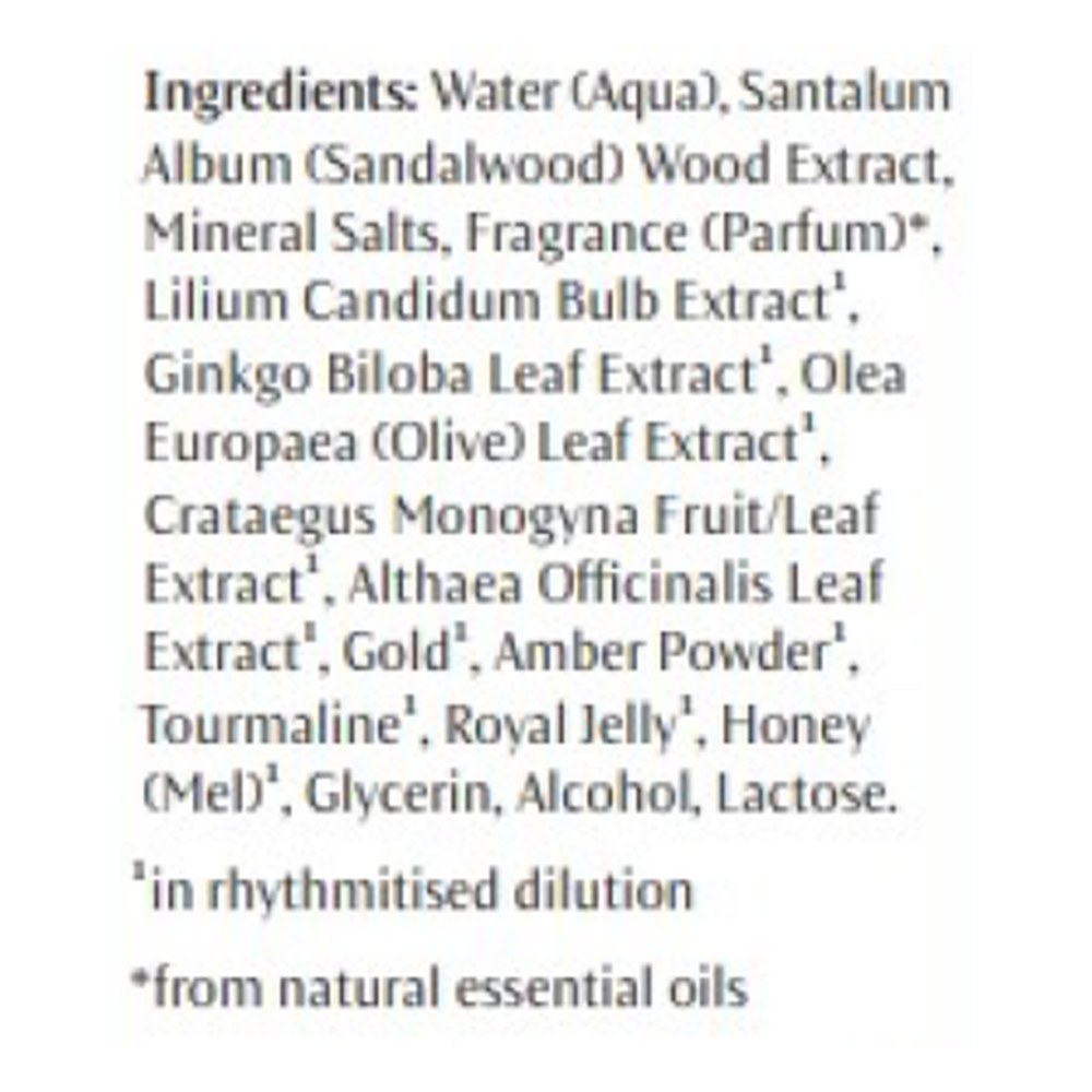 Formulation: Rhythmitised dilutions of madonna lily, gingko and hawthorn work with gemstones blue tourmaline, amber and gold to help support skin’s processes of renewal, minimizing the appearance of fine lines and wrinkles.