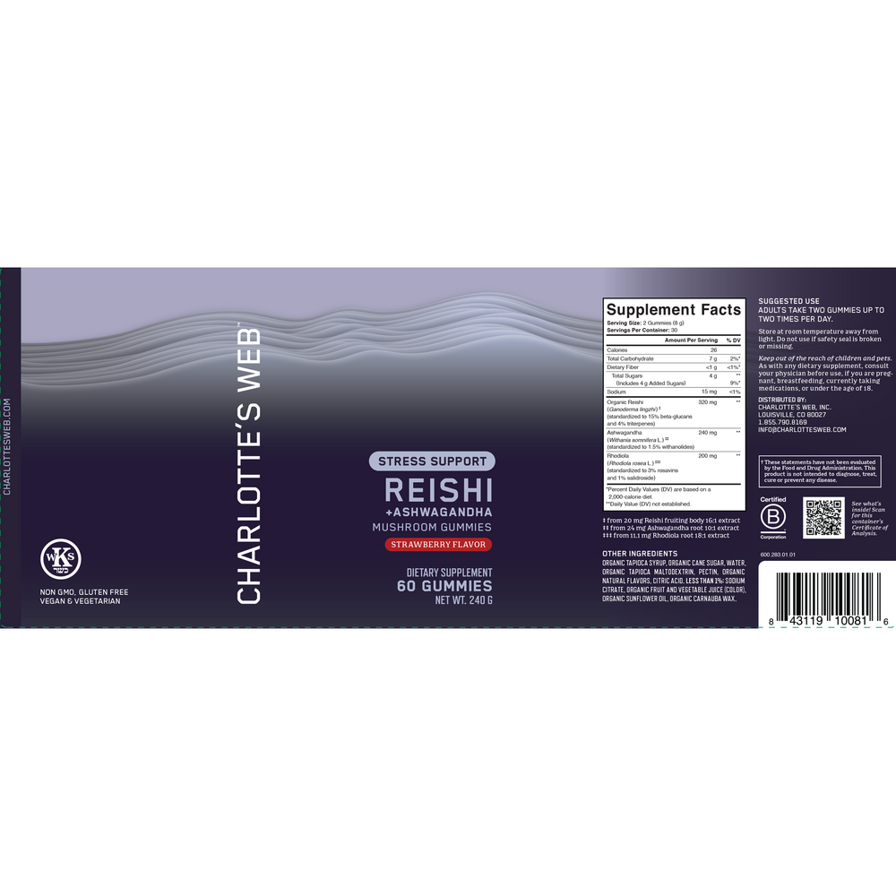 Charlotte’s Web™ Stress Support Gummies are formulated with organic Reishi (Ganoderma lingzhi) fruiting body 16:1 extract to provide a dry weight equivalent of 320mg of fresh Reishi mushroom per two-gummy serving as well as 240mg Ashwagandha (Withania somnifera) root and 200mg Rhodiola (Rhodiola rosea) root. This blend of adaptogens and at efficacious potencies will help support healthy cortisol levels and daily stress response.* Superior quality is guaranteed through 3rd-party testing for purity and potency as well as being certified kosher. Patients and practitioners alike will enjoy the satisfying Strawberry fruit flavor and that the formulas are gluten-free, CBD-free, vegan, and non-GMO.