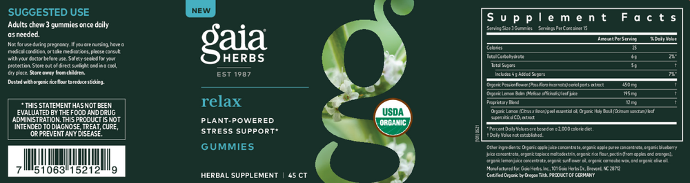 Gaia Herbs' Certified Organic Relax Gummies contain a specially formulated blend of herbs traditionally used for maintaining emotional well-being and supporting a sense of calm and relaxation, including Passionflower, Holy Basil, and Lemon Balm.* They’re made without any preservatives or artificial colors or flavors—and are sweetened only with real fruit—for 100% plant-powered stress support that works with your healthy lifestyle.*