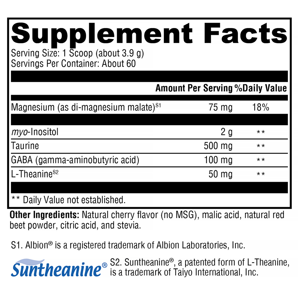 RelaxMax® is an innovative formula in the form of cherry-flavored, powdered drink mix. It contains a blend of ingredients that supports the body's natural synthesis of catecholamines, the inhibitory neurotransmitter GABA, hormonal balance, and healthy glucose metabolism. RelaxMax aims to promote a calm, relaxed, well-balanced emotional and physiological state.*
