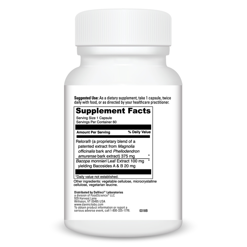 A dietary supplement to support stress management, satiety and a balanced mood.* Relora® with Bacopa is a unique formula that combines the adaptogenic and neurotonic benefits of Bacopa standardized extracts with Relora®, a proprietary blend to promote a sense of calm.*
