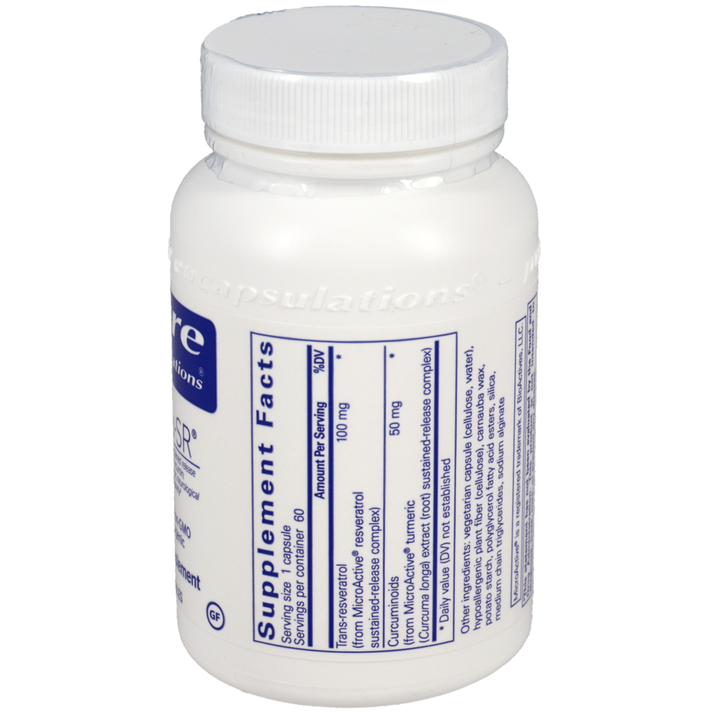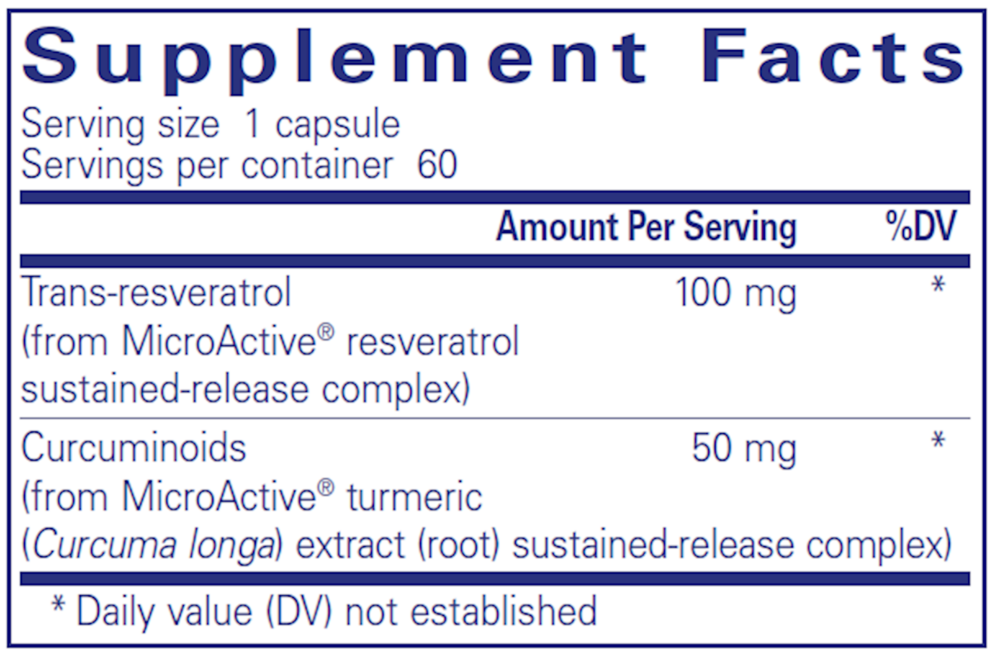Resveratrol and curcumin support longevity, cardioprotection and neurological health. Recent studies have demonstrated antioxidant synergy and convergent mechanisms. The combination of sustained-release MicroActive® Resveratrol and MicroActive® Curcumin is exclusive to Pure Encapsulations.*
