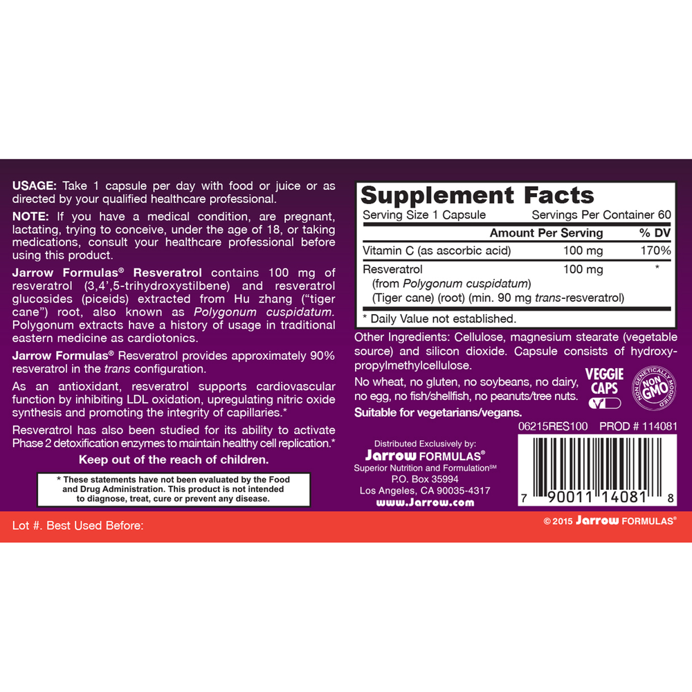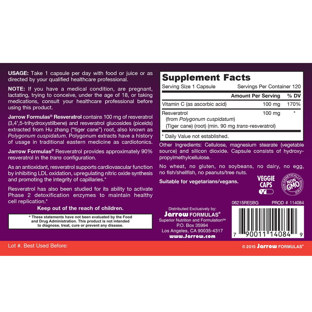 "Jarrow Formulas® Resveratrol features trans-resveratrol (3,4,5-trihydroxystilbene) and resveratrol glucosides (piceids) from Polygonum cuspidatum. As a polyphenol antioxidant naturally found in the skin of red grapes, certain berries and other plants, research supports that resveratrol helps tosupport healthy cardiovascular function.*"