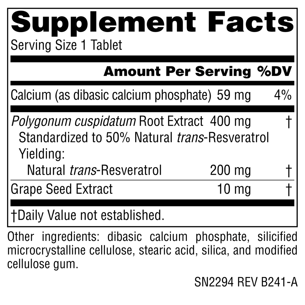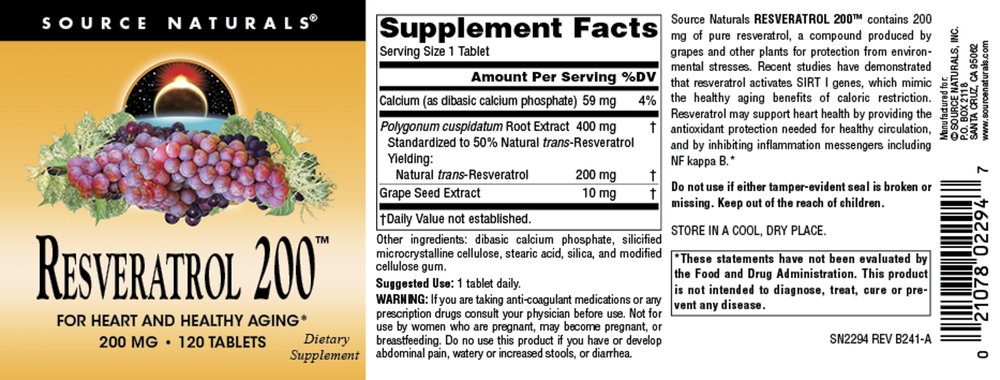 Source Naturals Resveratrol 200‚Ñ¢ contains 200 mg of pure resveratrol, a compound produced by grapes and other plants for protection from environmental stresses.* Recent studies have demonstrated that resveratrol activates SIRT I genes, which mimic the healthy aging benefits of caloric restriction. Resveratrol may support heart health by providing the antioxidant protection needed for healthy circulation, and by inhibiting inflammation messengers including NF kappa B.*