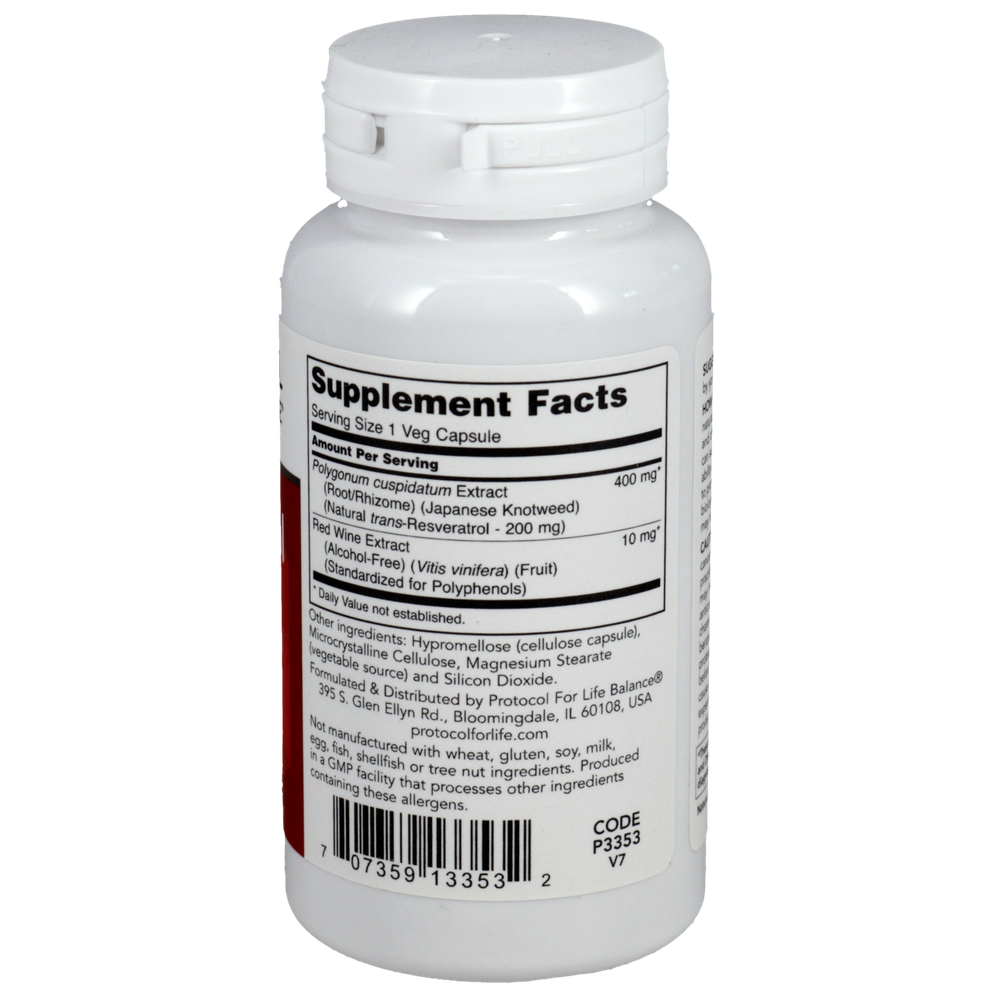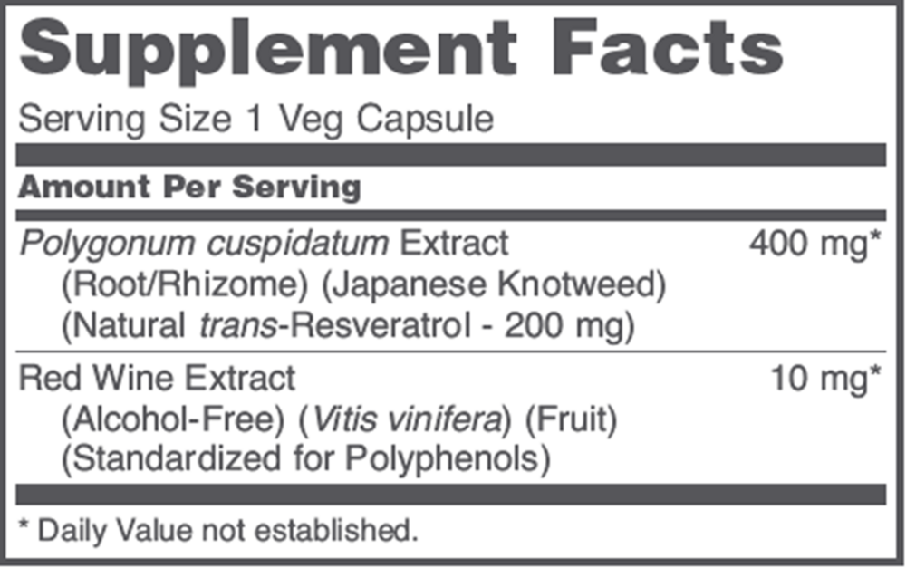 Not manufactured with wheat, gluten, soy, milk, egg, fish, shellfish or tree nut ingredients. Produced in a GMP facility that processes other ingredients containing these allergens.Store in a cool, dry place. Please Recycle.Certain populations, such as the French and the Greeks, have a low incidence of coronary artery disease, despite a diet relatively high in saturated fat. It has been suggested that regular consumption of red wine may explain this phenomenon, which is called the "French paradox." Evidence indicates that Resveratrol, a constituent of red wine, may play a key role in this phenomenon.Resveratrol has been found to exert a number of potentially beneficial effects with respect to cardiovascular health. As an antioxidant, Resveratrol can synergize with CoQ10; it has also been shown to help maintain healthy levels of glutathione.* In addition, Resveratrol has been shown to support a healthy inflammatory response, as well as healthy blood clotting functions through its effects on the COX-2 enzyme.*CAUTIONS AND INTERACTIONS: Women who have had breast cancer, or are at high risk, should consult a healthcare practitioner before using this product. Resveratrol may interact with NSAIDs and anticoagulant/antiplatelet medications; as well as with drugs metabolized by Cytochrome P450 3A4 such as statins, calcium channel blockers, anti-arrhythmic agents, antihistamines, benzodiazepines, erectile dysfunction drugs, and HIV protease inhibitors. Please consult a healthcare practitioner before use if taking any of these drugs. This product may cause digestive upset in some sensitive individuals. If you experience any gastrointestinal discomfort after using this product, discontinue its use.This bottle contains an AGELESS® Oxygen Absorber to ensure freshness. Do not eat packet.*This statement has not been evaluated by the Food and Drug Administration. This product is not intended to diagnose, treat, cure or prevent any disease.