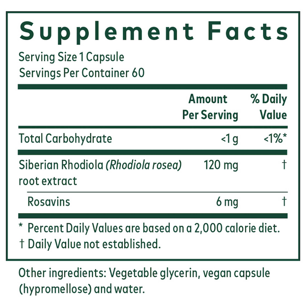 Adaptogen Stress Support* Rhodiola is a potent herb that is thought to help the body adapt to stress in a healthy way.* Ecologically harvested from the pristine alpine meadows of Siberia, _Gaia Herbs' Rhodiola_ optimizes energy levels while promoting a healthy mood.* Each serving is concentrated to contain 6 mg of active Rosavins, delivering guaranteed quality and potency.