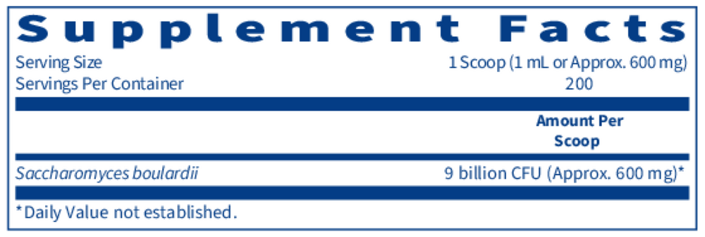 This single ingredient Saccharomyces boulardii powder comes with a dual scoop for measuring accuracy. This clean-label formulation is particularly effective and uniquely convenient for use in high-potency titration protocols. Saccharomyces boulardii is a nonpathogenic, transient yeast. Since its discovery in 1920, clinicians worldwide have used S. boulardii to support normal bowel transit time, promote healthy immune and inflammatory response, and bolster gastrointestinal microbiota diversity. S. boulardii is also commonly used to safely and effectively displace undesirable yeast species, which may play a beneficial role in neurological health, particularly for individuals on the spectrum.*