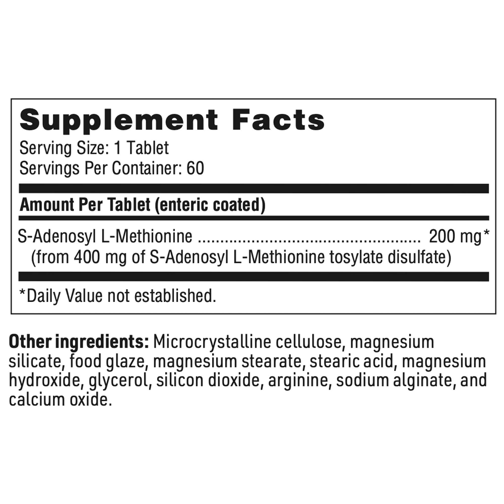 The reactive nature of SAMe prevents it from being used in combination nutrient products, but it can be stabilized as a single ingredient with careful manufacturing and an enteric tablet coating. This product provides a pharmaceutical grade, stabilized SAMe manufactured under low temperature and low humidity conditions. An enteric tablet coating is applied to further ensure a biologically active product. Each tablet contains a full 200 mg of elemental SAMe from 400 mg SAMe tosylate disulfate.