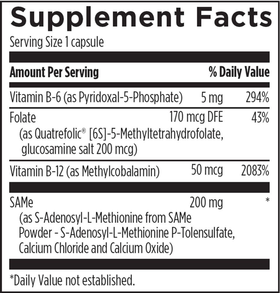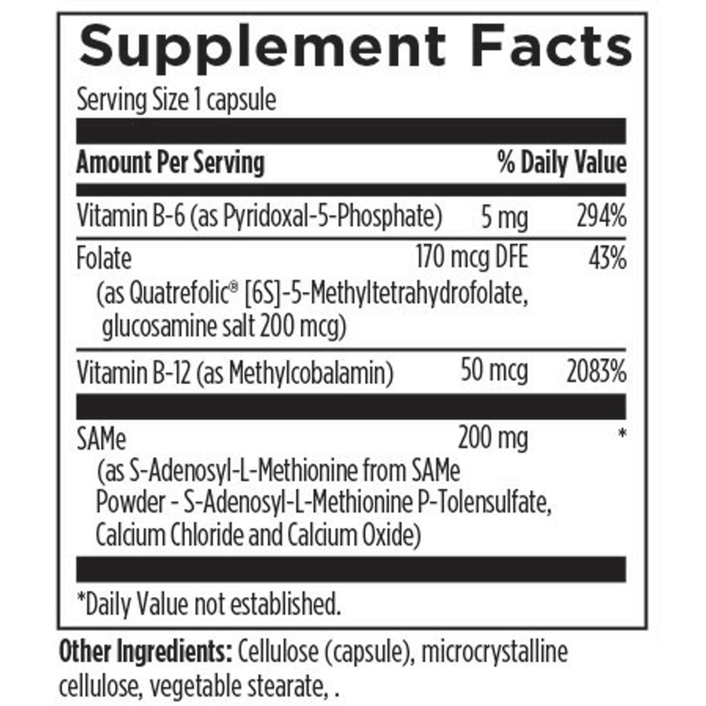 SAMe is a naturally occurring metabolite found in the human body as well as in plant and animal foods. It is the most active of all methyl donors and has been compared to ATP in its importance for the body. SAMe is naturally synthesized in humans from the amino acid methionine in the presence of the cofactors vitamin B12 and folate. SAMe is involved in the synthesis of neurotransmitters, the hormone melatonin, phospholipids, and polyamines, which control cellular growth. It is also the source of methyl groups inside the nucleus for DNA methylation, which controls gene expression and masking of genetic damage.*