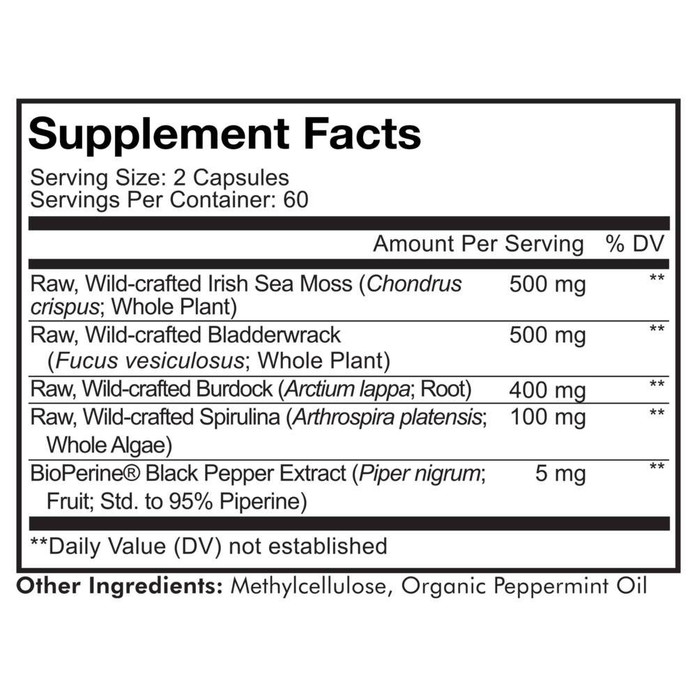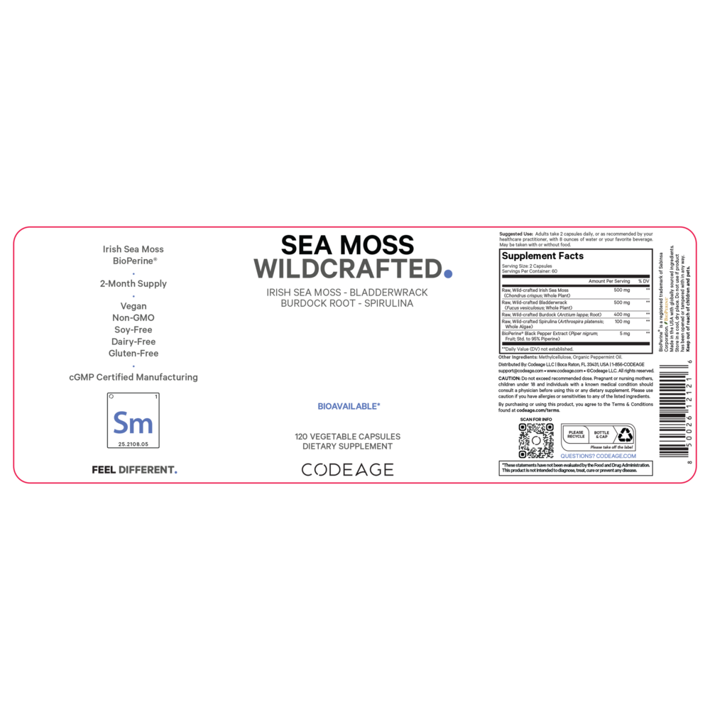Codeage Wildcrafted Sea Moss delivers 500 mg per serving of raw wildcrafted Irish sea moss, a superfood-rich red seaweed. This raw seaweed vegan complex contains botanical extracts from raw Fucus vesiculosus, a comestible, and nutrient-rich brown algae also known as bladderwrack, which is sustainably wildcrafted and sourced, and 400 mg of wildcrafted burdock root per serving.This superfood supplement also features raw wildcrafted spirulina and BioPerine black pepper fruit extract standardized to 95% piperine. Organic peppermint oil has been added to this whole algae Arthrospira platensis formulation for no aftertaste. Each bottle of Codeage Wildcrafted Sea Moss offers 2 months of supply.