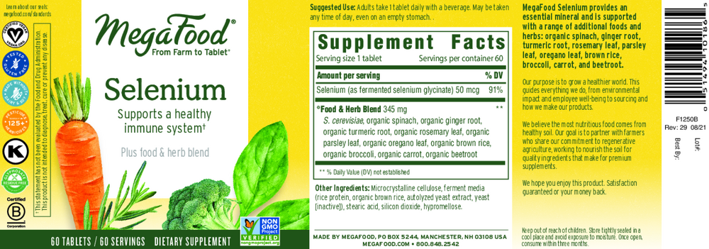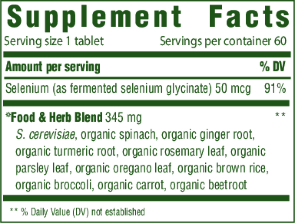 Supports optimal health* MegaFood® Selenium, an essential mineral, functions as an antioxidant, and is supported with the inclusion of organic spinach, organic ginger root, organic turmeric root, organic rosemary leaf, organic parsley leaf, organic oregano leaf, organic brown rice, organic broccoli, organic carrot, organic beetroot, and botanicals*